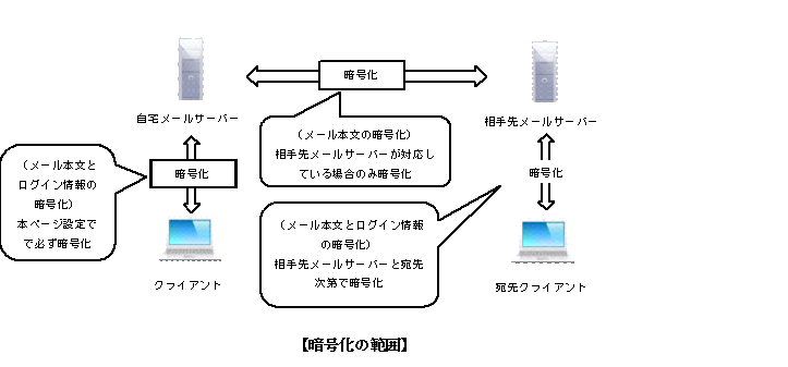 メールの送受信を行う場合、ユーザー名、パスワードやメール本文が盗み見される恐れがあるため、メールサーバー間の通信内容を暗号化する。