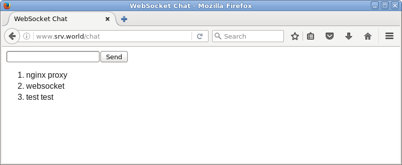 例として、バックエンドのポート 1337 で起動しているサンプルアプリケーションを、ポート 80 で待ち受ける Nginx が /chat でプロキシする設定です。 サンプルアプリケーションはこちらの [3] の簡易チャットを利用します。