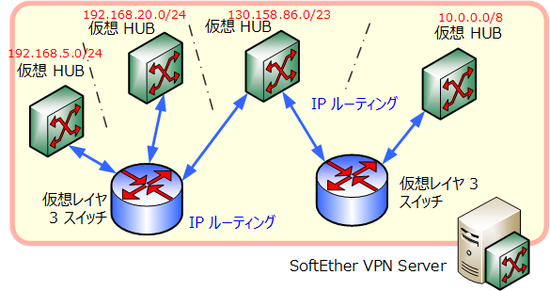 この方法で、離れた拠点場所の仮想 HUB または物理的な LAN 同士を仮想レイヤ 3 スイッチによって接続し、IP ルーティングの仕組みをうまく取り入れた拠点間接続 VPN を構築することができます。