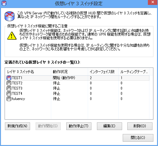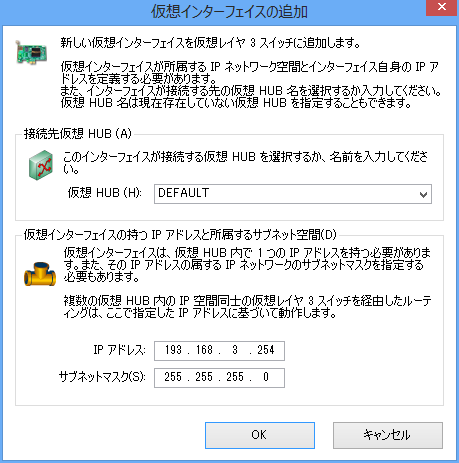 仮想レイヤ 3 スイッチには、複数の仮想インターフェイスを作成することができます。通常は 2 個以上の仮想インターフェイスを追加します (1 個だけの場合はほとんど役に立ちません)。仮想レイヤ 3 スイッチによってルーティングの対象にしたい仮想 HUB をすべて登録してください。
