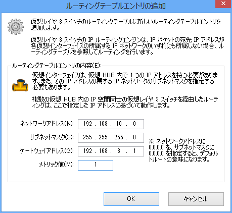 仮想レイヤ 3 スイッチは、通常の物理的なルータやレイヤ 3 スイッチと同様に、「ルーティングテーブル」を持っています。仮想レイヤ 3 スイッチは、特に何も指定しなくても、仮想 HUB に対して接続している仮想インターフェイスがあれば、その仮想インターフェイスに設定されている IP アドレスとサブネットマスクによって決定される IP ネットワークへのルート情報を持っています。したがって、仮想レイヤ 3 スイッチに対して直接接続されているレイヤ 2 セグメントに対するルーティングテーブルは定義する必要はありません。