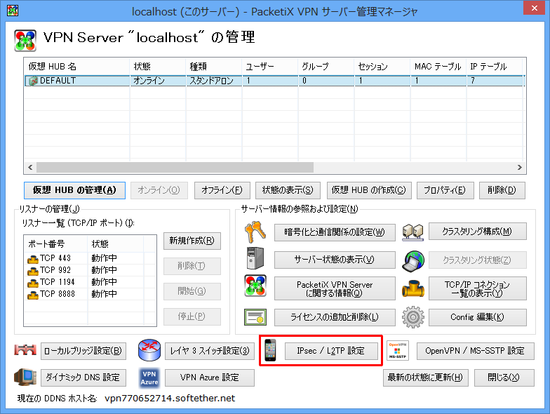 VPN サーバー管理マネージャ (Windows 上で動作する GUI アプリケーション) から IPsec 機能が搭載された版の VPN Server サービスにサーバー全体の管理者モードで接続すると、[IPsec / L2TP 設定] というボタンが新たに追加されていますので、これをクリックしてください。