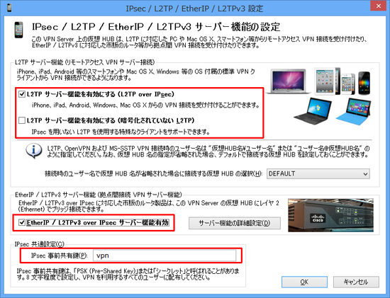 ただし、接続時のユーザー名で仮想 HUB が省略 ('@' 以降の文字列が指定されていない) された場合は、あらかじめ IPsec サーバー機能の設定画面で選択されているデフォルトの仮想 HUB が選択されます。