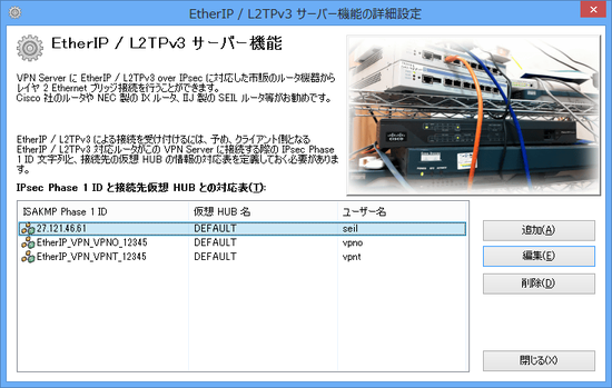 EtherIP / L2TPv3 を使用する場合は、EtherIP / L2TPv3 設定項目中の [サーバー機能の詳細設定] ボタンをクリックして、EtherIP / L2TPv3 クライアント (ルータ等) が VPN Server に対して IPsec 接続を行おうとする際に提示される ISAKMP (IKE) Phase 1 の ID 文字列と、接続先の仮想 HUB や仮想 HUB 内のユーザーの設定との関連付けを事前に登録しておく必要があります。