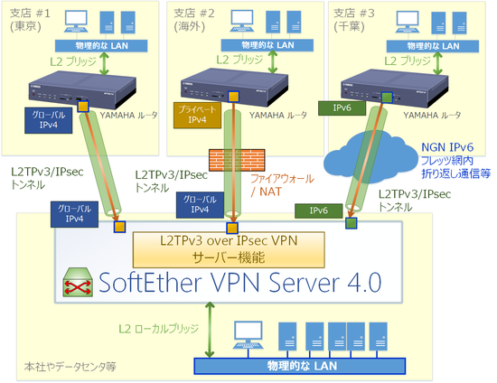 1 台または複数台の YAMAHA ルータを各拠点に設置し、本社に設置した SoftEther VPN Server に対して VPN 接続を行う場合における設定方法を示します。
