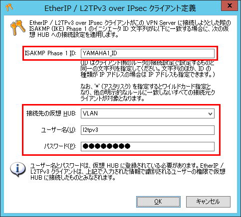 そのため、L2TPv3 プロトコルによって VPN Server に IPSec で接続する際には IPSec の鍵交換プロトコル (ISAKMP / IKEv1) の Phase 1 の ID 交換の際にルータから提示される ID を元に、どこの仮想 HUB にどのユーザとしてブリッジ接続を行うのかを定義しておかなければなりません。