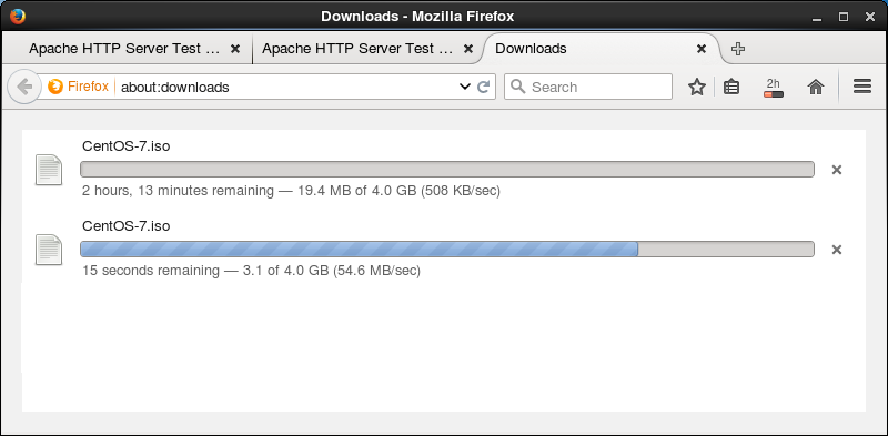 以下の例は、上が帯域制限したディレクトリからのダウンロード、下が設定なしのディレクトリからのダウンロードです。