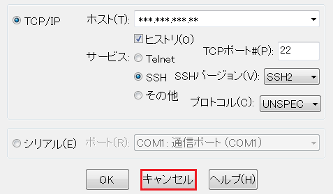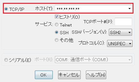 TeraTermを起動後、メールに記載されたIPアドレスを「TCP/IP」に入力します。