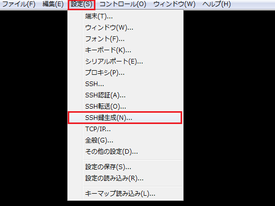 「設定」をクリック後、「SSH鍵生成」を選択します。