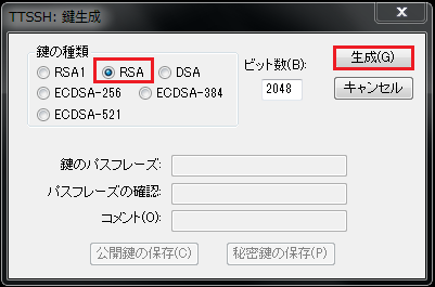 「鍵の種類」選択後、「生成」をクリックします。 ※ここでは、「RSA」を選択します。