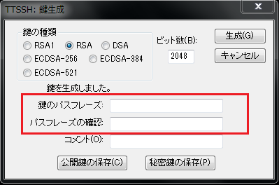 「鍵を生成しました。」と表示後、「鍵のパスフレーズ」「パスフレーズの確認」を入力します。 ※このパスフレーズは、ログイン時に利用します。