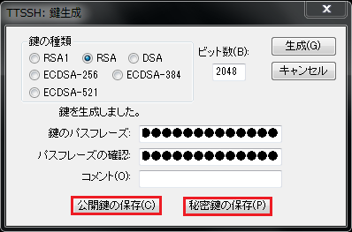 「公開鍵の保存」「秘密鍵の保存」をそれぞれクリック後、事前に作成した鍵を格納するフォルダに保存します。 ※以下の名前で保存されます