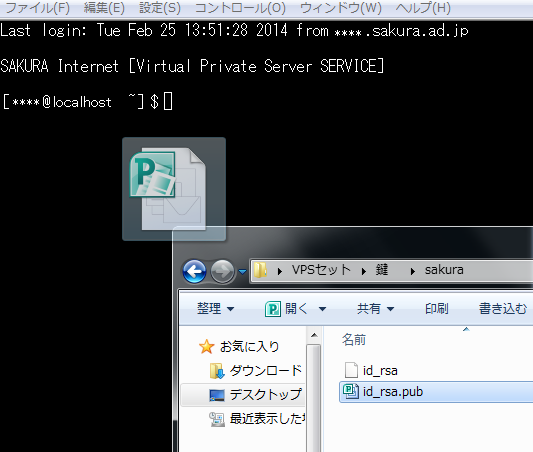 サーバにログイン完了後、事前に作成した「公開鍵」のファイルをドラック&ドロップします