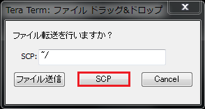 「ファイル転送を行いますか?」と表示後、「SCP」をクリックします。 ※「SCP」クリックすると、ユーザのホームディレクトリに転送されます。