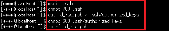$ mkdir .ssh $ chmod 700 .ssh $ cat id_rsa.pub > .ssh/authorized_keys $ chmod 600 .ssh/authorized_keys $ rm -f id_rsa.pub