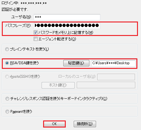 ユーザ名/パスフレーズを入力後、「RSD/DSA鍵を使う」をクリックし、予め保存しておいた「秘密鍵」を選択します。